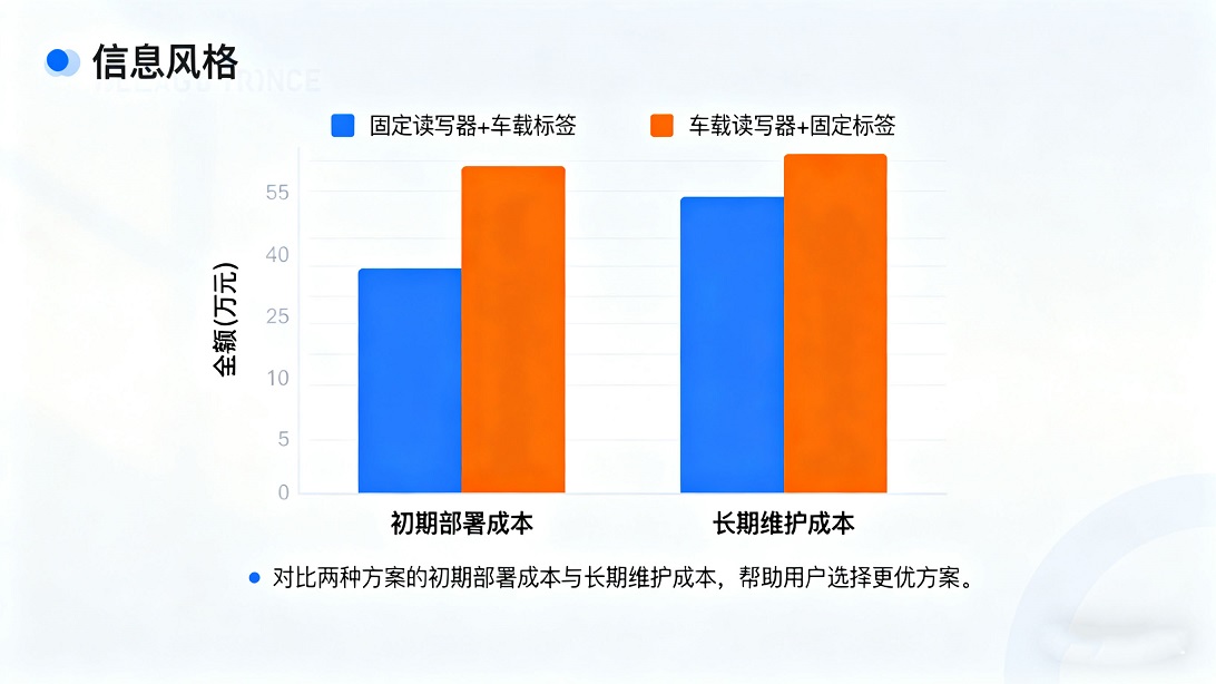 初期中等(車載讀寫器單價 300-500 元 / 臺,無需布線);長期極低(固定標簽成本低,損壞后更換便捷) |